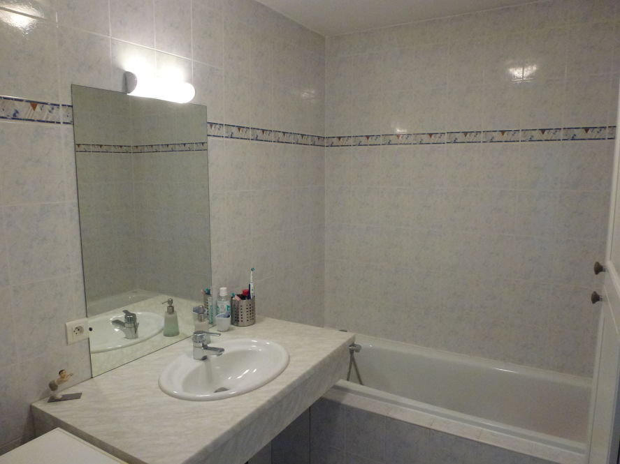 une entrée, une cuisine équipée, un salon séjour avec accès terrasse, une salle de bain avec baignoire et un wc séparé,